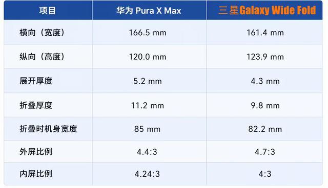 根据此前该博主晒出的数据,三星Galaxy Wide Fold的厚度(展开4.3mm、折叠9.8mm),同样也要低于华为Pura X Max(展开5.2mm、折叠11.2mm)。