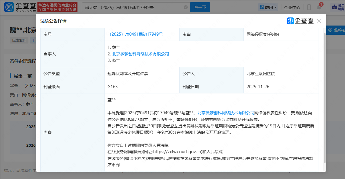 近日寻钱网,法院刊登魏大勋起诉蓝某某等网络侵权责任纠纷开庭公告。据悉,该案计划将于举证期满后第3日在北京互联网法院线上法庭公开开庭审理。