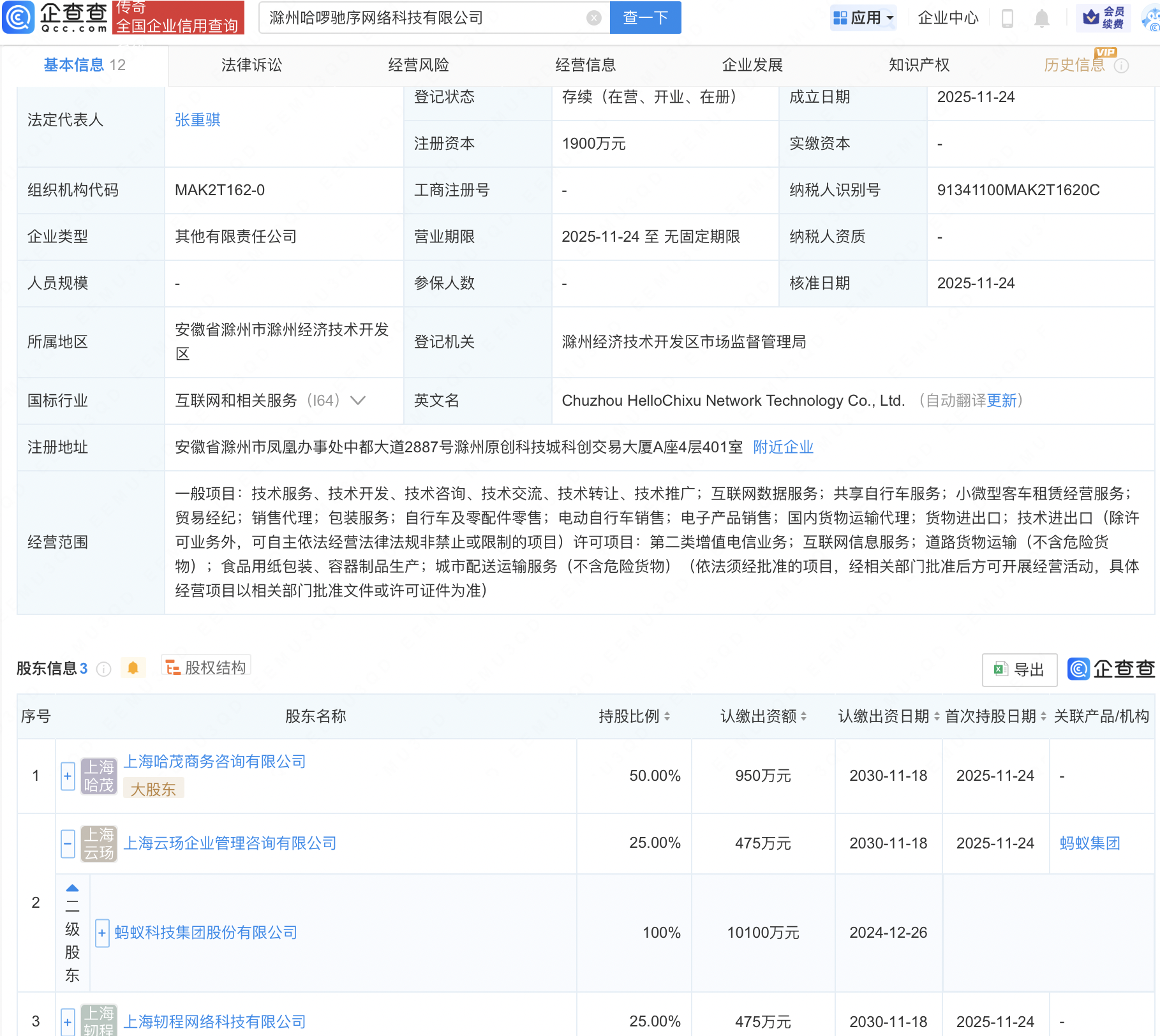 近日闪牛,滁州哈啰驰序网络科技有限公司成立,注册资本1900万元,经营范围包含:互联网数据服务;共享自行车服务;小微型客车租赁经营服务;贸易经纪等。企查查股权穿透显示,该公司由蚂蚁科技集团股份有限公司全资子公司上海云玚企业管理咨询有限公司等共同持股。